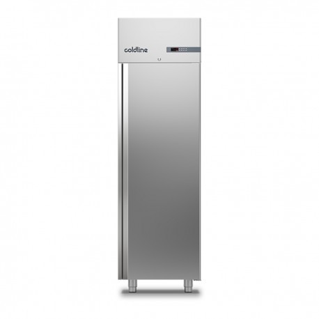 Cette armoire réfrigérée négative -18/-22°C, de COLDLINE, dispose d'une capacité de 500 litres. Elle est dotée d'une structure monocoque tout inox AISI304 18/10 (sauf arrière de l’armoire) avec des angles intérieurs arrondis, d'une porte avec fermeture à clef d'origine, d'une large poignée ergonomique intégrée sur toute la hauteur en acier inox AISI304. Cette armoire réfrigérée positive professionnelle à réfrigération ventilée est équipée d'une porte à fermeture automatique, avec blocage de l’ouverture à 105° et joints magnétiques facilement remplaçables, d'un éclairage intérieur, d'un évaporateur traité anti corrosion, d'un thermostat électronique (alarme température mini / maxi, alarme porte ouverte, ...)