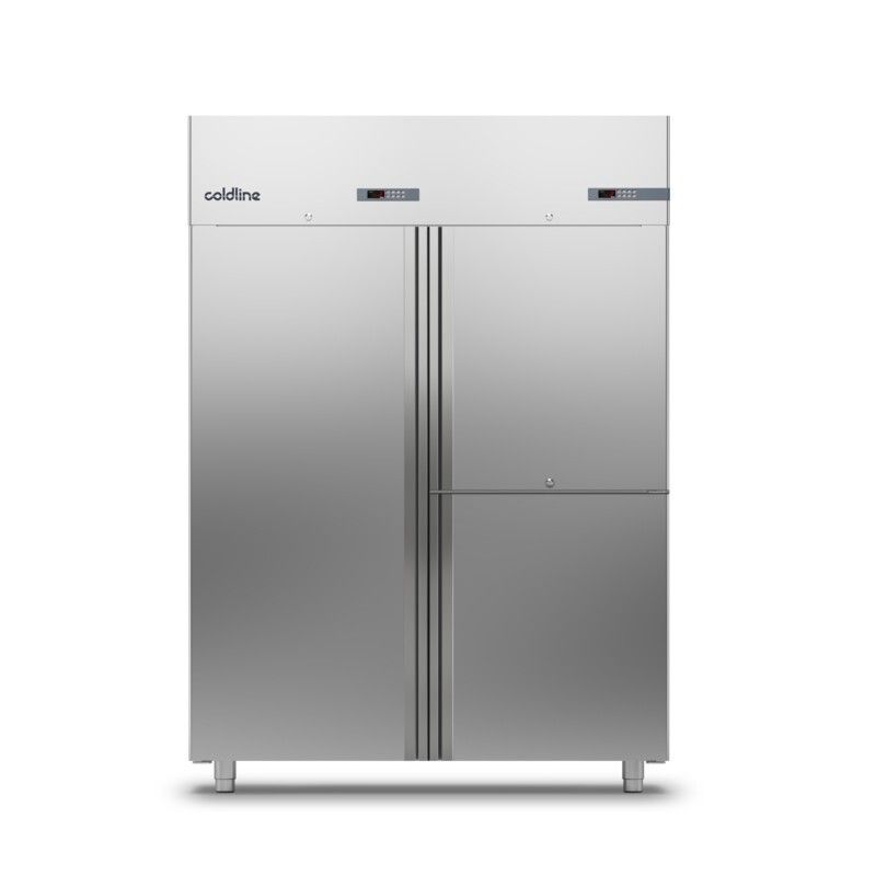 Cette armoire réfrigérée à double température -2°C +8°C/-18°C -22°C, de COLDLINE, dispose de deux groupes frigorifiques, de compartiments cloisonnés pour une capacité de 1400 litres. Elle est dotée d'une structure monocoque tout inox AISI304 18/10 (sauf arrière de l’armoire) avec des angles intérieurs arrondis, d'une porte avec fermeture à clef d'origine, d'une large poignée ergonomique intégrée sur toute la hauteur en acier inox AISI304. Cette armoire réfrigérée professionnelle à double température et à réfrigération ventilée est équipée d'une porte à fermeture automatique, avec blocage de l’ouverture à 105° et joints magnétiques facilement remplaçables, d'un éclairage intérieur, d'un évaporateur traité anti corrosion, d'un thermostat électronique (alarme température mini / maxi, alarme porte ouverte, ...)