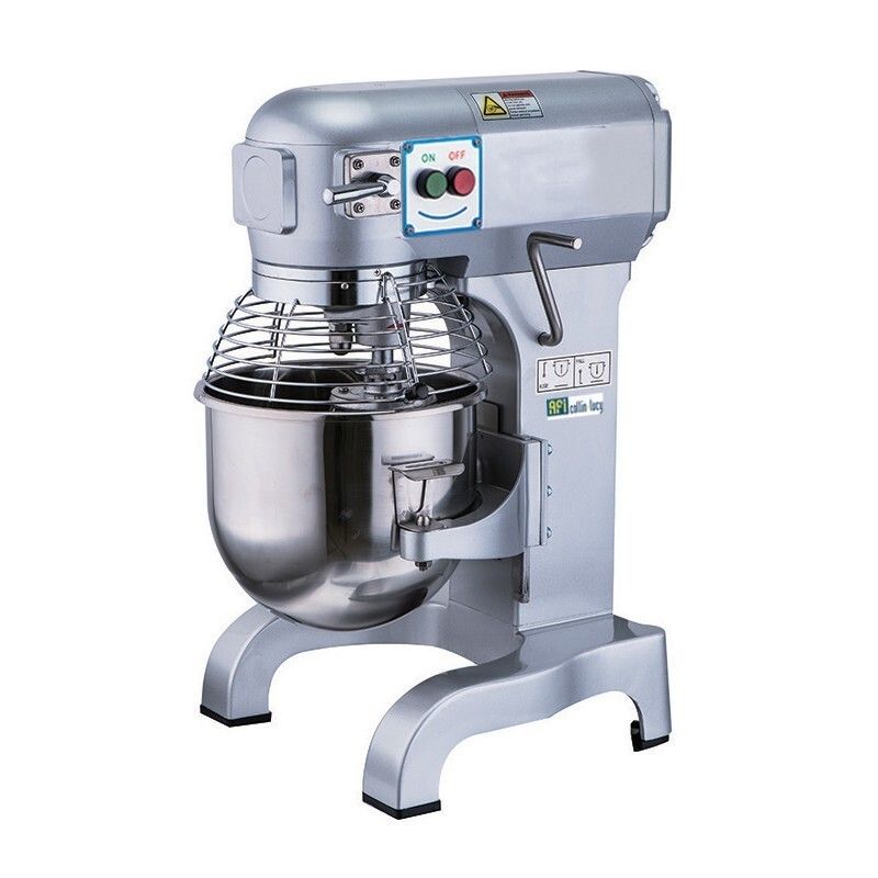 Entraînement par engrenage Corps en aluminium Interrupteur de sécurité 3 vitesses 3 outils (crochet, palette, fouet) Capacité cuve : 10 litres Farine : 2 kg Pâte : 3 kg Vitesses (rpm) : 3 Vit. 1 = 108 Vit. 2 = 195 Vit. 3 = 355 Puissance : 0,45 kW 220 V 1Ph 50 Hz Poids : 68 kg Dimensions : 485 x 410 x 635 mm