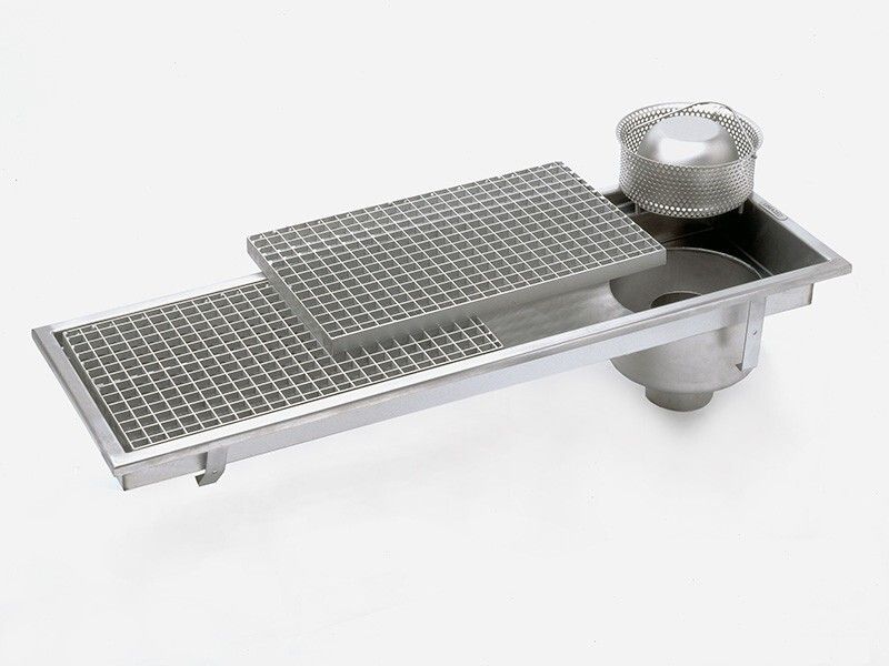 Pentes incorporées rejoignant un siphon cloche à sortie verticale placé selon la largeur à l’extrémité ou au centre du caniveau