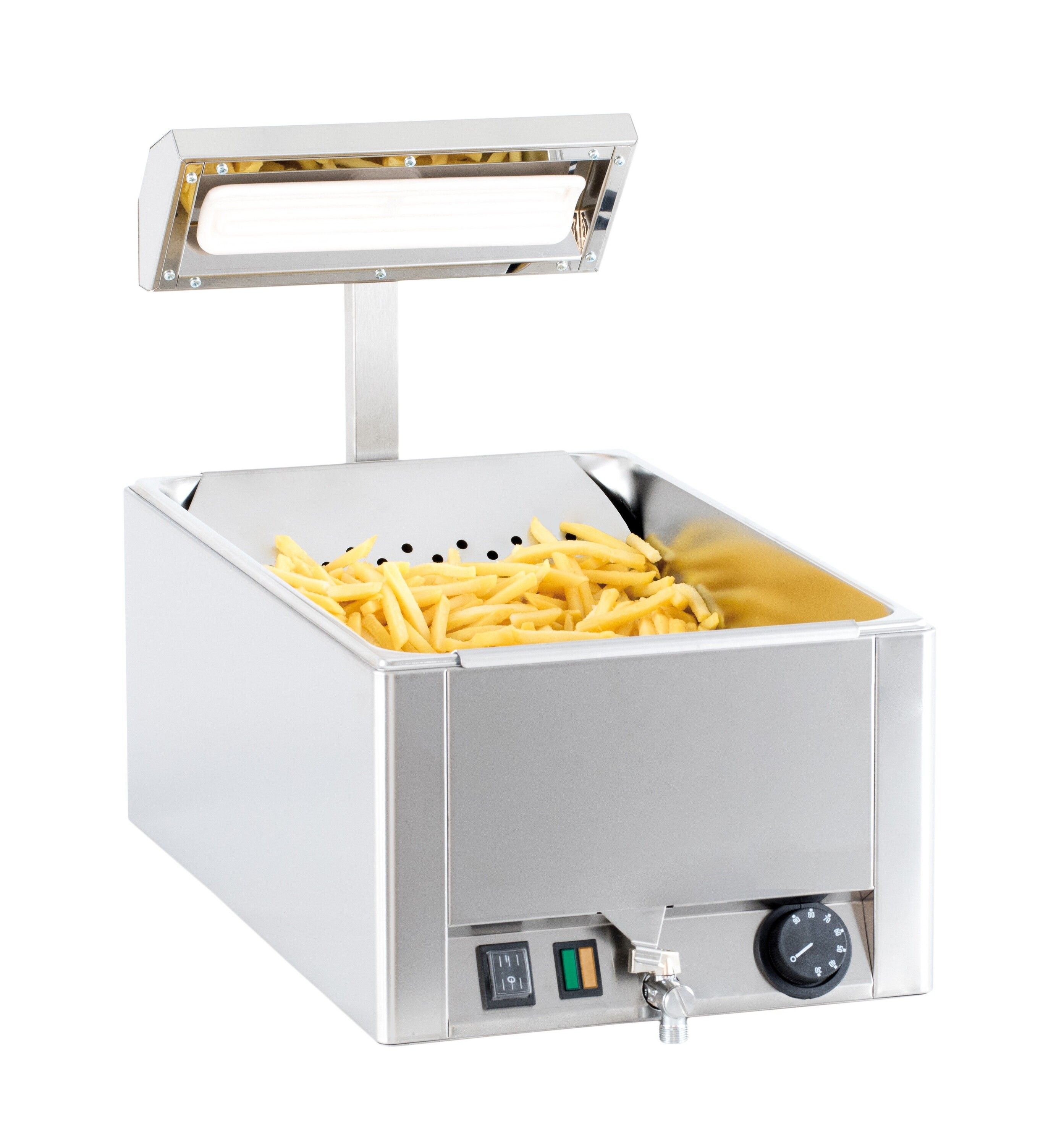 Inox AISI 310 Résistance en céramique Thermostat réglable de 30°C à 90°C Robinet de vidange Bac de salage inclus Capacité GN 1/1, profondeur 150 mm Puissance : 1 200 W / 230 V Dimensions : L 330 x P 540 x H 500 mm Poids : 12,3 Kg