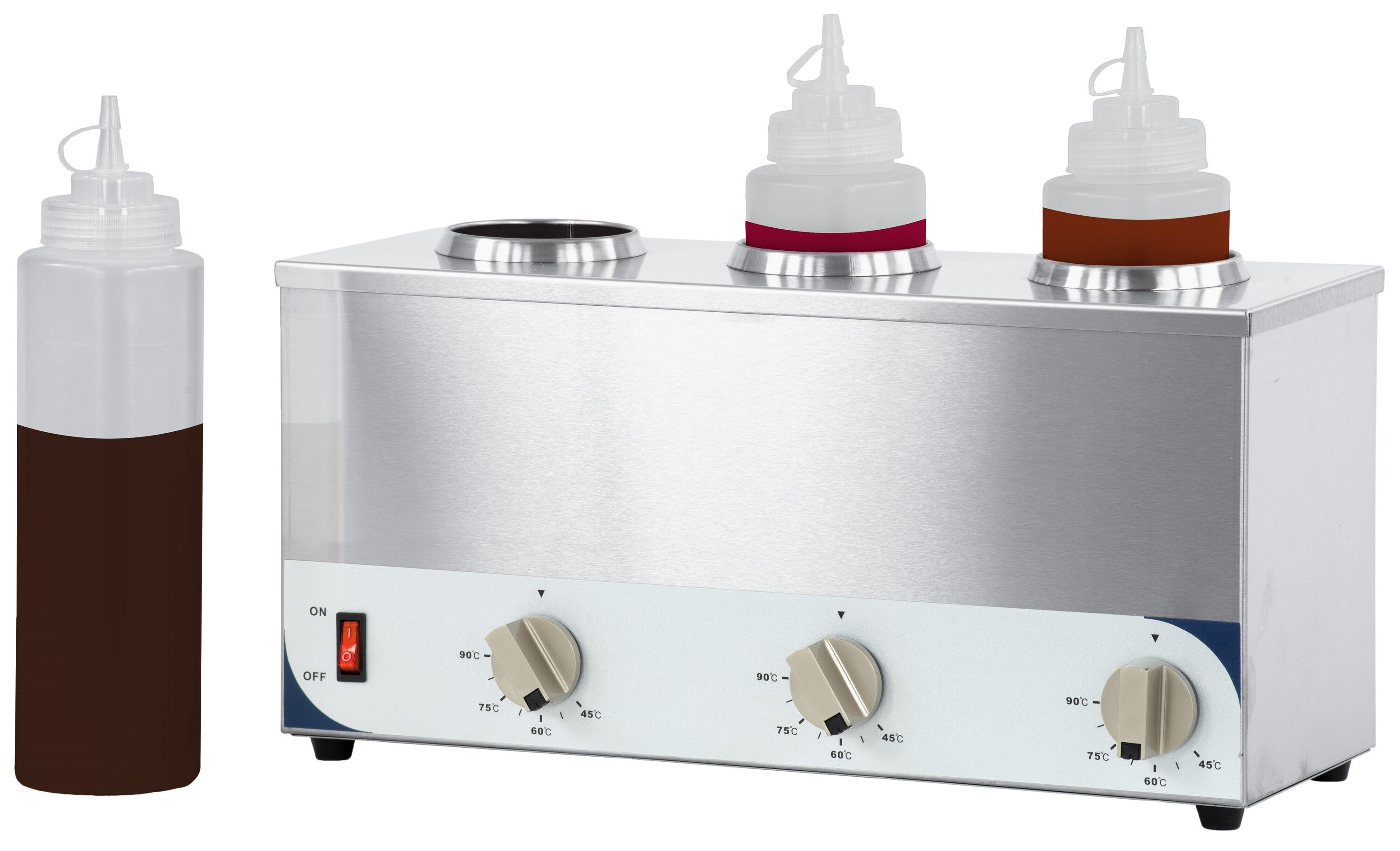 Acier inoxydable Bouton ON/OFF Thermostat réglable de 0°C à 90°C 3 Bouteilles à sauce 1L inclue Diamètre de chauffe : 77 mm Profondeur de chauffe : 190 mm Puissance : 600 W / 230 V Dimensions : L 447 x P 165 x H 230 mm Poids : 5,25 Kg