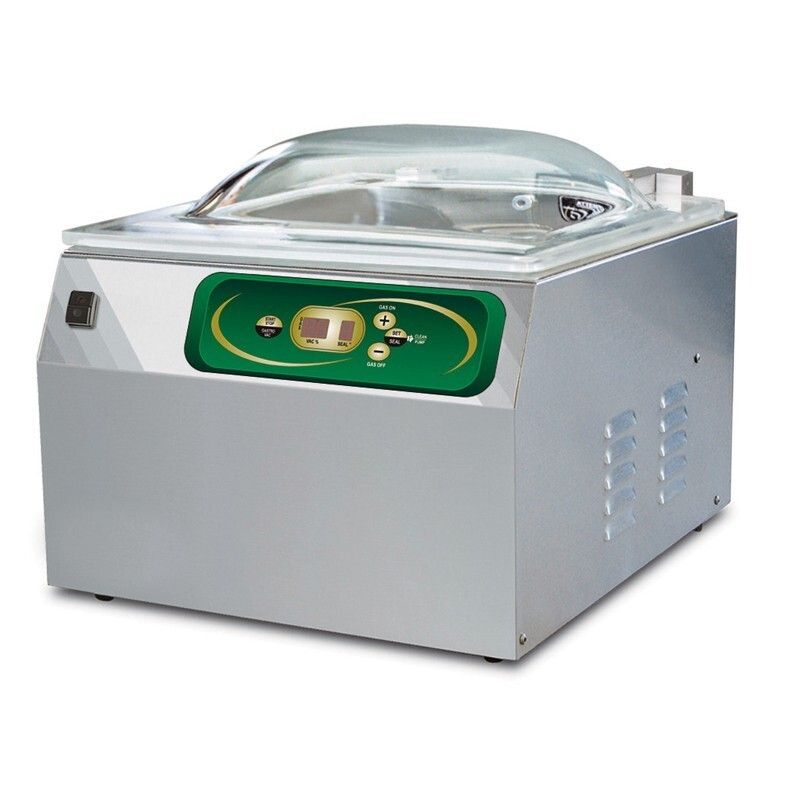 L'extérieure de cette machine sous vide de table à cloche est construite tout en inox avec une cuve avec angles arrondis. Elle dispose d'un affichage digital avec mono programme, d'un système de soudure composé d’une barre en inox avec une résistance plate (6 mm), extractible pour un nettoyage facile. Fonctionnement semi automatique. Mise en marche manuelle (bouton START / STOP). Ouverture manuelle du couvercle.