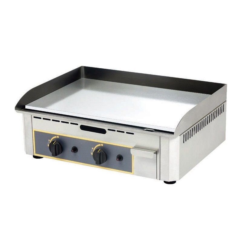 • Plaque de cuisson acier (10 mm) avec revêtement chrome : très bon transfert de température(s’utilise uniquement avec des spatules en bois ou silicone)• Répartition homogène de la chaleur sur l’ensemblede la plaque• Disponibles en version électrique et en version gaz• Entretien facile : tiroir de récupération de