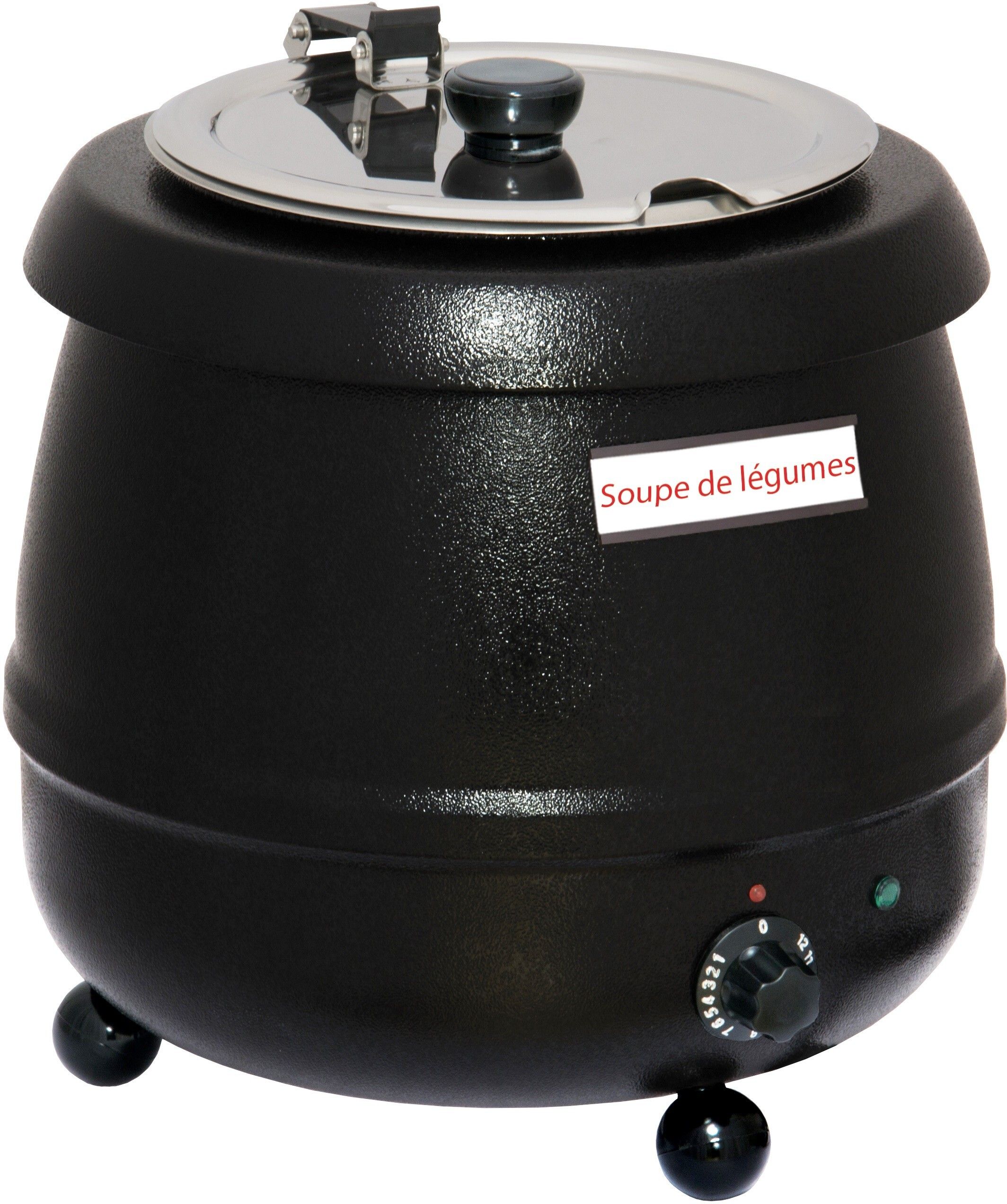 Boîtier en tôle d’acier thermolaqué Inclus récipient amovible en inox Couvercle en inox tournant et rabattable Couvercle ajouré avec poignées isolées contre la chaleur Thermostat réglable de 30°C à 95°C Contenance : 9 L Puissance : 400 W / 230 V Dimensions : Ø 345 mm, H 360 mm Poids : 4,5 Kg