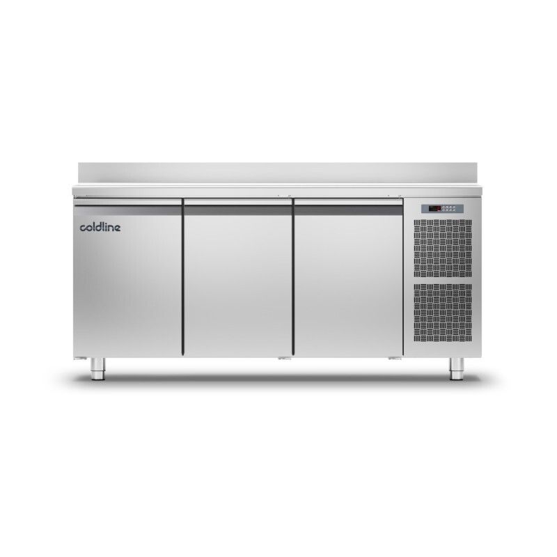 Cette table réfrigérée négative -15°C -20°C de COLDLINE en construction monocoque tout inox 18/10 arrière et dessous compris dispose d'un volume de 356 litres, d'un Groupe logé à gauche ou à droite, d'angles internes arrondis, d'un groupe tropicalisé ambiance +43°C, d'un tableau de commandes à gauche ou à droite, d'un évaporateur ventilé, d'un plan de travail renforcé épaisseur 40 mm avec bords arrondis, de pieds réglables en hauteur, de 3 portes avec maintien en position ouverte à 105°, de joints de portes magnétiques facilement démontables, d'un évaporateur traité anti-corrosion, du dégivrage automatique par gaz chaud et réévaporation automatique des condensats, d'un thermostat électronique et d'un affichage digital. Isolation 60 mm sans CFC. Alimentation : 230 V. Gaz réfrigérant : R404a.