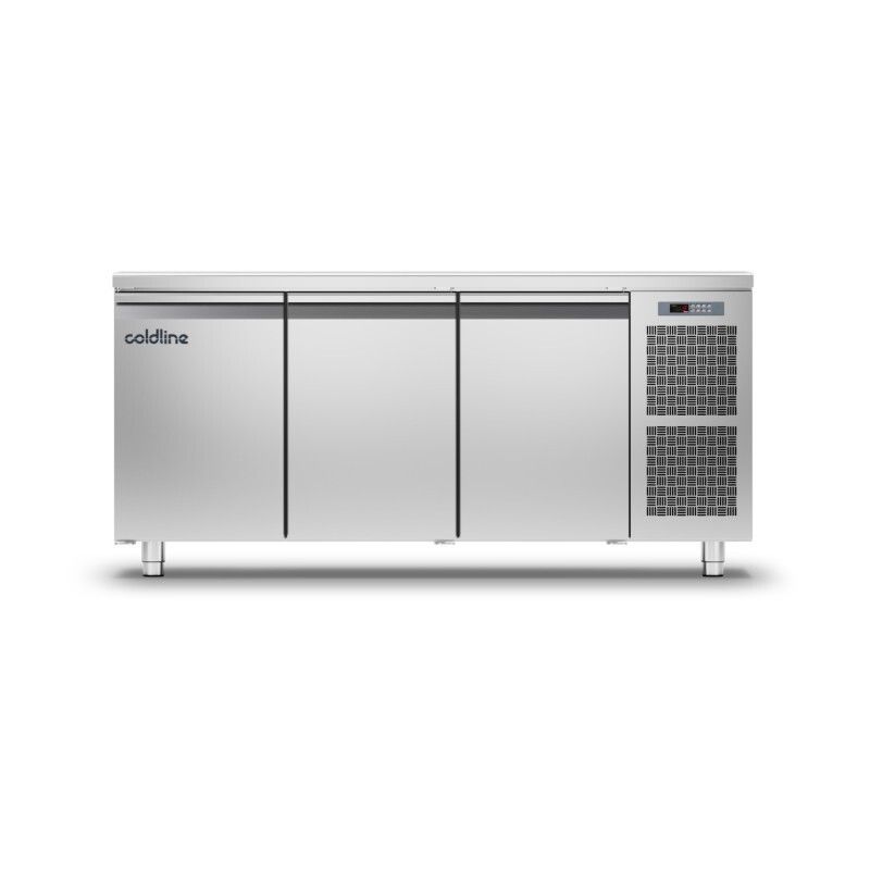Cette table réfrigérée négative -15°C -20°C de COLDLINE en construction monocoque tout inox 18/10 arrière et dessous compris dispose d'un volume de 415 litres, d'un Groupe logé à gauche ou à droite, d'angles internes arrondis, d'un groupe tropicalisé ambiance +43°C, d'un tableau de commandes à gauche ou à droite, d'un évaporateur ventilé, d'un plan de travail renforcé épaisseur 40 mm avec bords arrondis, de pieds réglables en hauteur, de 3 portes avec maintien en position ouverte à 105°, de joints de portes magnétiques facilement démontables, d'un évaporateur traité anti-corrosion, du dégivrage automatique par gaz chaud et réévaporation automatique des condensats, d'un thermostat électronique et d'un affichage digital. Isolation 60 mm sans CFC. Alimentation : 230 V. Gaz réfrigérant : R404a.