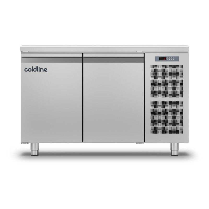 Cette table réfrigérée négative -15°C -20°C de COLDLINE en construction monocoque tout inox 18/10 arrière et dessous compris dispose d'un volume de 260 litres, d'un Groupe logé à gauche ou à droite, d'angles internes arrondis, d'un groupe tropicalisé ambiance +43°C, d'un tableau de commandes à gauche ou à droite, d'un évaporateur ventilé, d'un plan de travail renforcé épaisseur 40 mm avec bords arrondis, de pieds réglables en hauteur, de 2 portes avec maintien en position ouverte à 105°, de joints de portes magnétiques facilement démontables, d'un évaporateur traité anti-corrosion, du dégivrage automatique par gaz chaud et réévaporation automatique des condensats, d'un thermostat électronique et d'un affichage digital. Isolation 60 mm sans CFC. Alimentation : 230 V. Gaz réfrigérant : R404a.