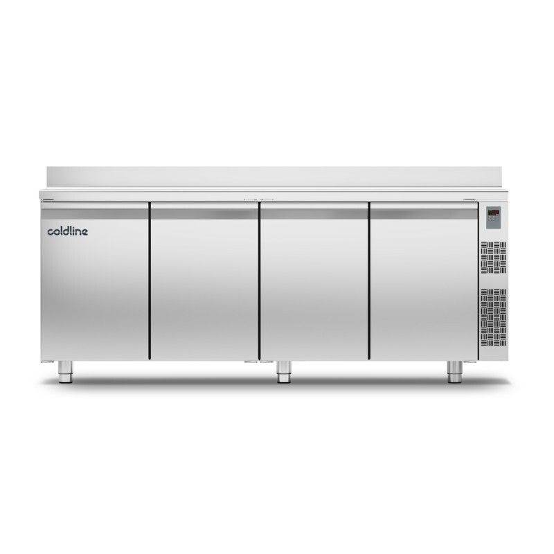 Cette table réfrigérée négative -15°C -20°C de COLDLINE en construction monocoque tout inox 18/10 arrière et dessous compris dispose d'un volume de 480 litres, d'angles internes arrondis, d'un tableau de commandes à gauche ou à droite, d'un évaporateur ventilé, d'un plan de travail renforcé épaisseur 40 mm avec bords arrondis, de pieds réglables en hauteur, de 4 portes avec maintien en position ouverte à 105°, de joints de portes magnétiques facilement démontables, d'un évaporateur traité anti-corrosion, du dégivrage automatique par gaz chaud et réévaporation automatique des condensats, d'un thermostat électronique et d'un affichage digital. Isolation 60 mm sans CFC. Alimentation : 230 V. Gaz réfrigérant : R404a.