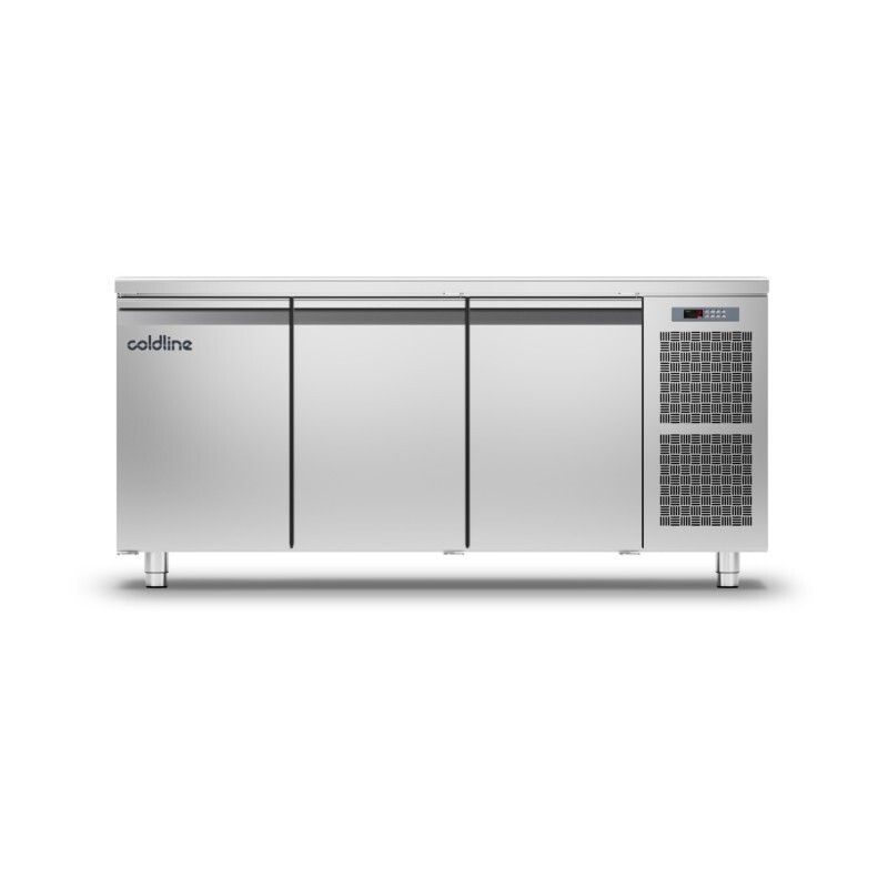 Cette table réfrigérée positive -2°C +8°C de COLDLINE en construction monocoque tout inox 18/10 arrière et dessous compris dispose d'un volume de 125 litres, d'un Groupe logé à gauche ou à droite, d'angles internes arrondis, d'un groupe tropicalisé ambiance +43°C, d'un tableau de commandes à gauche ou à droite, d'un évaporateur ventilé, d'un plan de travail renforcé épaisseur 40 mm avec bords arrondis, de pieds réglables en hauteur, de 3 portes avec maintien en position ouverte à 105°, de joints de portes magnétiques facilement démontables, d'un évaporateur traité anti-corrosion, du dégivrage automatique par gaz chaud et réévaporation automatique des condensats, d'un thermostat électronique et d'un affichage digital. Isolation 60 mm sans CFC. Alimentation : 230 V. Gaz réfrigérant : R404a.
