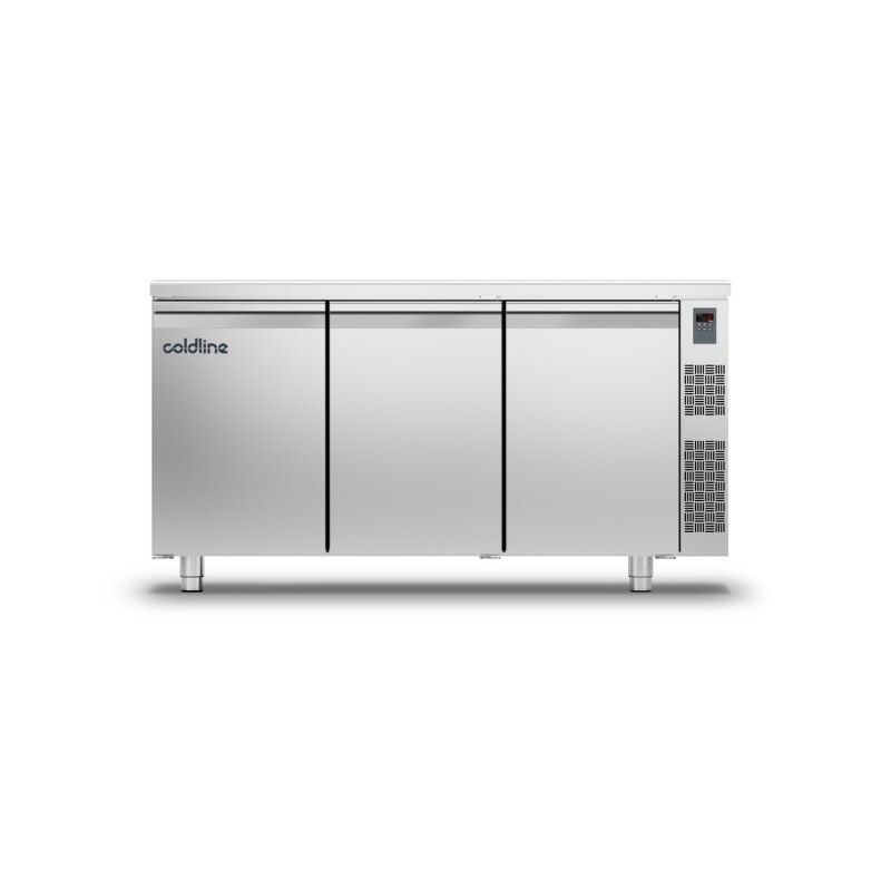 Cette table réfrigérée positive -2°C +8°C de COLDLINE en construction monocoque tout inox 18/10 arrière et dessous compris dispose d'un volume de 356 litres, d'angles internes arrondis, d'un tableau de commandes à gauche ou à droite, d'un évaporateur ventilé, d'un plan de travail renforcé épaisseur 40 mm avec bords arrondis, de pieds réglables en hauteur, de 3 portes avec maintien en position ouverte à 105°, de joints de portes magnétiques facilement démontables, d'un évaporateur traité anti-corrosion, du dégivrage automatique par gaz chaud et réévaporation automatique des condensats, d'un thermostat électronique et d'un affichage digital. Isolation 60 mm sans CFC. Alimentation : 230 V. Gaz réfrigérant : R404a.